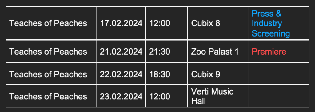 Wir sind überaus begeistert, euch mitteilen zu dürfen, dass unser Film „Teaches of Peaches “ auf den 74. Internationalen Filmfestspielen Berlin in der Sektion Panorama seine Weltpremiere feiern wird.